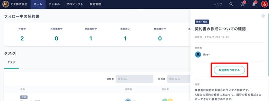 法務相談の内容をサイドバーで確認した後、サイドバー内のボタンを押すだけで契約書を作成できるため、作業の流れの中で自然に法務相談と契約を結び付けることができます。