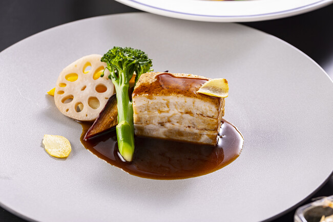 総料理長 水口がおすすめするのはステーションで提供する「北陸の冬の王者」と呼ばれる上品な甘味と旨味が凝縮したズワイガニ。蟹酢、レモン、カクテルソース、ハリッサマヨネーズからお好みのコンディメントとともにお楽しみください。寒ブリ、ホタル烏賊、越前鶏、白エビといった北陸の旬の食材を使用した前菜約10種はビュッフェ形式で、選べるメインは「越前鶏とフォアグラのバロティーヌ 白エビのリゾット」、「越乃黄金豚バラ肉のブレゼ 加賀野菜 いちごとバルサミコのソース」、「ブイヤベース(タラ、牡蠣、蟹、バイ貝)」、「のどぐろと白エビのベニエ リングイネパスタと一緒に」から1品お選びいただけます。デザートには北陸産の洋ナシ「ル・レクチェ」を使ったゼリーなど4種類をご用意。コンラッド東京ならではの和洋中の調理法を駆使した美食の北陸をぜひご堪能ください。