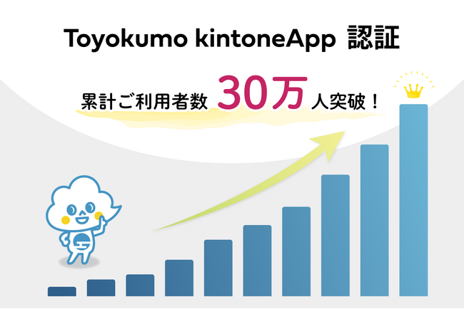 トヨクモ株式会社(本社:東京都品川区、代表取締役社長:山本 裕次、以下トヨクモ)は、サイボウズ株式会社(本社:東京都中央区、社長:青野 慶久、以下サイボウズ)が提供する業務改善プラットフォームである「kintone」と連携する次世代型ユーザー管理機能「Toyokumo kintoneApp認証」のご利用者数が、30万ユーザーを突破したことをお知らせします。2023年7月に20万人突破のリリースを出しており、5ヶ月で10万ユーザー数増加しました。