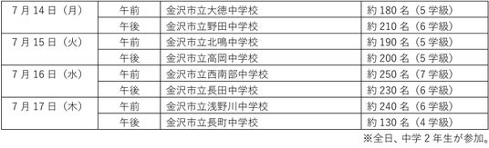 ■三谷産業金沢本社での「先端技術体験学習」実施日、実施校、生徒数(学級数)
