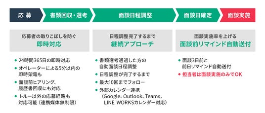 採用担当者にとって煩わしくかつ心理的負担の大きい、一次面談設定業務の大幅な改善が見込めます。