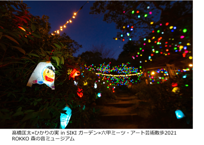 これまで「ザ・ナイトミュージアム~夜の芸術散歩~」として期間限定で六甲高山植物園とROKKO森の音(ね)ミュージアム等で夜間延長営業を行い、夜の作品をお楽しみいただいた当企画が、この度期間、料金設定、及び名称を改め「ひかりの森~夜の芸術散歩~」として新たに開催します。ライトアップされた“夜の幻想的な六甲山”を長くお楽しみいただくため、例年より約1ヵ月早く開始し、野外でも過ごしやすい季節からご鑑賞いただけます。今年も照明や映像を巧みに操って光の可能性に挑んでいるアーティスト、高橋匡太がROKKO森の音ミュージアムで参加型の光の作品「ひかりの実in SIKIガーデン」を展示し、六甲高山植物園でも光を用いた新作を展示します。
