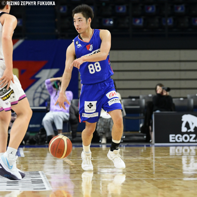 試合開始から#88 重冨(周)が積極的にゴールにアタックし、福岡のオフェンスにリズムを与える。#0 ジョーダンのミドルシュート、#55 ビバリーの3ポイントシュートで得点を重ねていくも、GAME1同様、福島のテンポの良いオフェンスを止めることができない。