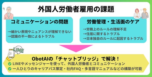 株式会社ObotAI(東京都港区、代表取締役社長:北見 好拡)は、特定技能外国人や技能実習生の受け入れ後に発生する課題やトラブル、労務管理や生活面のケアを、LINE等の主要なSNSを使ってスムーズにやり取りできる、AI文化翻訳アプリ「チャットブリッジ」の提供を開始したことをお知らせします。