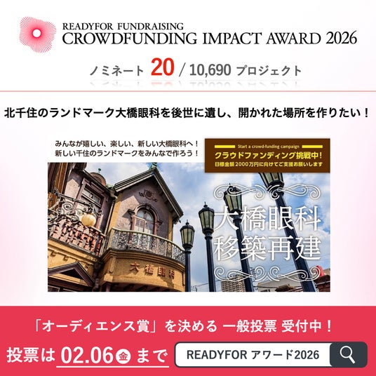 大橋眼科移築再建プロジェクト実行委員会(代表:阿部 朋孝)が実施したクラウドファンディング「北千住のランドマーク大橋眼科を後世に遺し、開かれた場所を作りたい!」が、クラウドファンディングサービスREADYFORが主催する「READYFORファンドレイジング クラウドファンディングインパクトアワード2026」にノミネートされました。