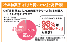 また、井村屋が冷凍和菓子シリーズの購入者に独自調査をしたところ、「4コ入冷凍和菓子シリーズをまた購入したいと思いますか?」という問いに対して、98%の方が「また買いたい」と回答いただくなど、販売開始から数カ月で大変好評を得ています。