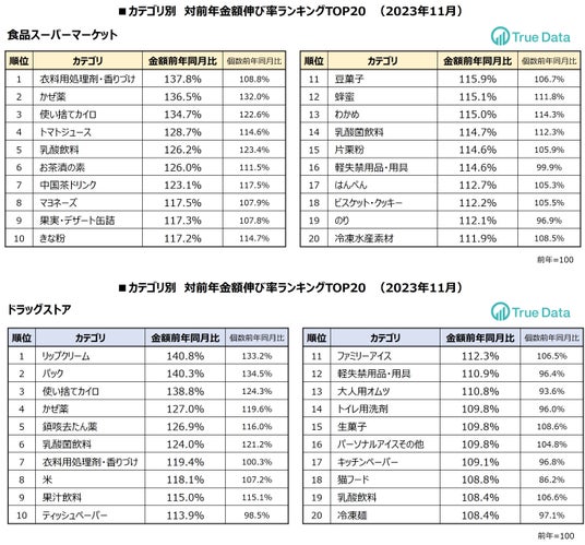 ~ドラッグストア、食品スーパーマーケット 2023年11月対前年伸び率TOP20カテゴリを発表~