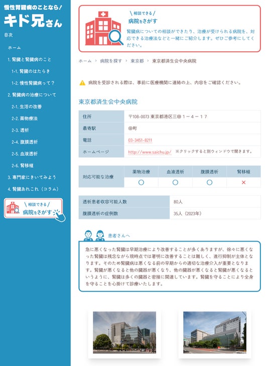 この取り組みにおける第一弾の医療機関として、東京都済生会中央病院の医師へ独自取材を行い、透析や施設に関するより深い情報提供に加え、透析患者収容可能人数や腹膜透析の2023年の症例数実績、医療機関から患者へのメッセージなども掲載しました。今後も賛同医療機関情報の拡大に努めていきます。