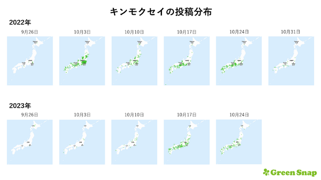 なお、北海道と沖縄ではキンモクセイの投稿がほとんど確認できませんでした。これは、キンモクセイの分布が主に本州、四国、九州に集中しているためと考えられ、一般的に言われる分布情報とも一致しています。
