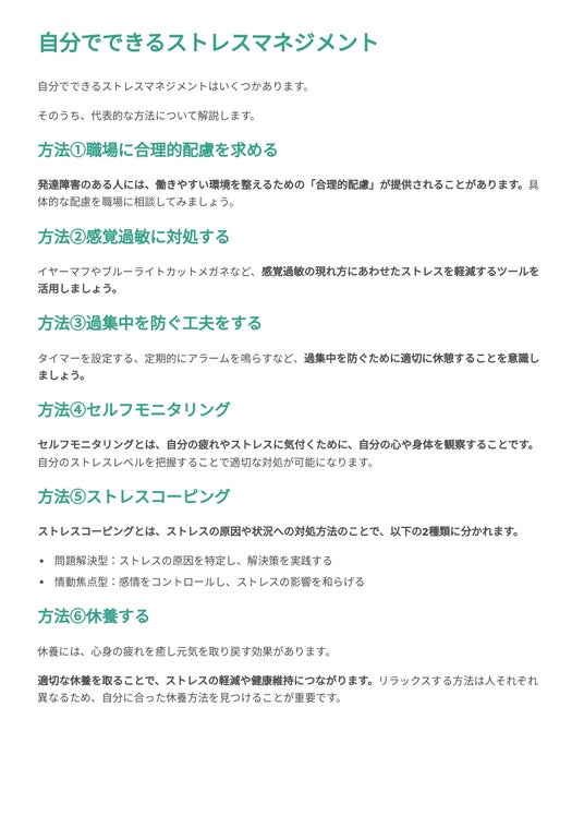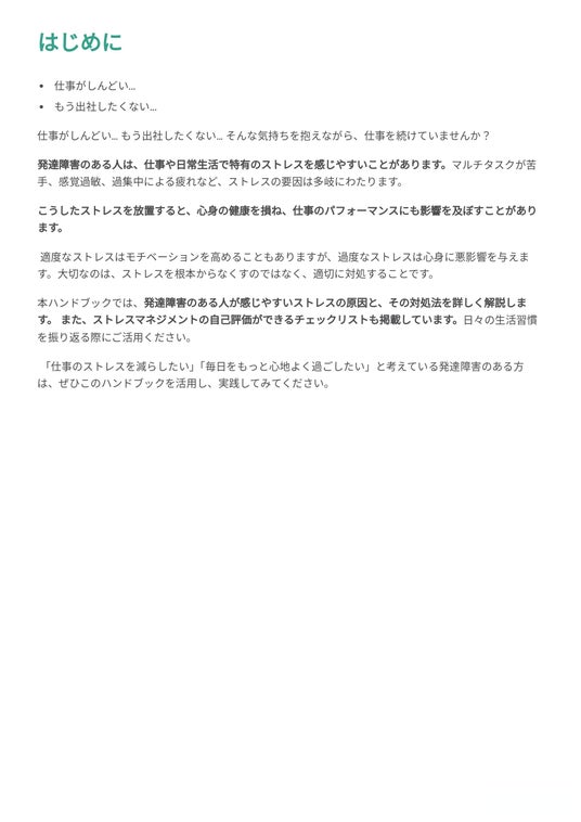 発達障害のある方への支援現場で蓄積された知見を活かし、当事者視点で作られた『発達障害特化型ストレス対策ハンドブック』を参考に、あなたなりのストレス対処法を見つけてみてください。