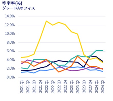 2024年7~9月期の大阪市中心部のグレードAオフィスマーケットでは、需要が供給をわずかに上回り、底堅い動きを継続しました。この期間中は、JR大阪駅直結する立地に「イノゲート大阪」が竣工しました。空室率は引き続き低水準を維持しており、平均想定成約賃料も緩やかに上昇し、今後の成長を見据えた安定的な市場動向が期待されます。