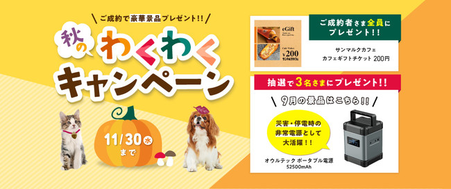 アイペット損害保険株式会社(本社:東京都江東区、代表取締役 執行役員社長:安田敦子 以下、当社)は2022年9月1日(木)から2022年11月30日(水)までの期間で「秋のわくわくキャンペーン」を実施しますので、お知らせいたします。