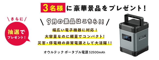 本キャンペーンは、期間中にお申込みいただいたご成約者さま全員に「サンマルクカフェ カフェギフトチケット 200円」をプレゼントします。さらに抽選で、毎月変わる豪華景品が当たります。9月は災害や停電時の非常電源として大活躍する「オウルテック ポータブル電源 52500mAh」を3名様にプレゼントします。