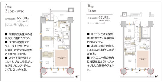 住戸の独立性、プライバシー性に配慮し、1フロア3邸でレイアウトしました。住戸の間取りは、通風・採光に優れた角住戸中心の2LDK・3LDK(専有面積57.93平方メートル ・65平方メートル )の3タイプを用意しています。室内は、バルコニー側の柱型を外に出したアウトフレーム設計で、家具を配置しやすい、すっきりとした空間です。上層階からは、都心部の眺望を望むことができ、開放感あふれる視界が広がります。