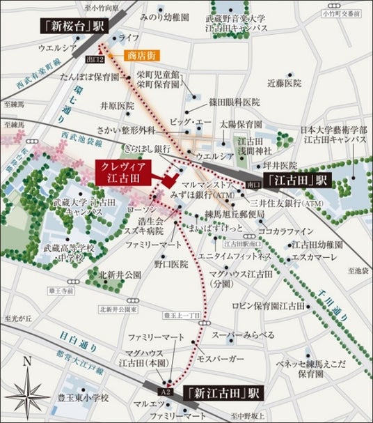 「クレヴィア江古田」は、西武池袋線「江古田」駅から徒歩4分に位置し、西武有楽町線「新桜台」駅(徒歩7分)と都営大江戸線「新江古田」駅(徒歩9分)の3駅3路線が利用可能です。「池袋」駅へ直通7分というアクセスの良さと、桜並木が美しい千川通りや商店街が広がる穏やかな住環境が魅力のエリアです。