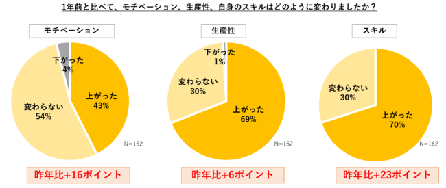 モチベーション、生産性、スキルが「上がった」が全て昨年比増