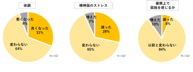 ハイブリッドワーク導入後「体調が良くなった」と回答した人は31%、業務上、孤独を感じるかについて「変わらない」と回答した人は84%。心理的安全性の担保にも貢献
