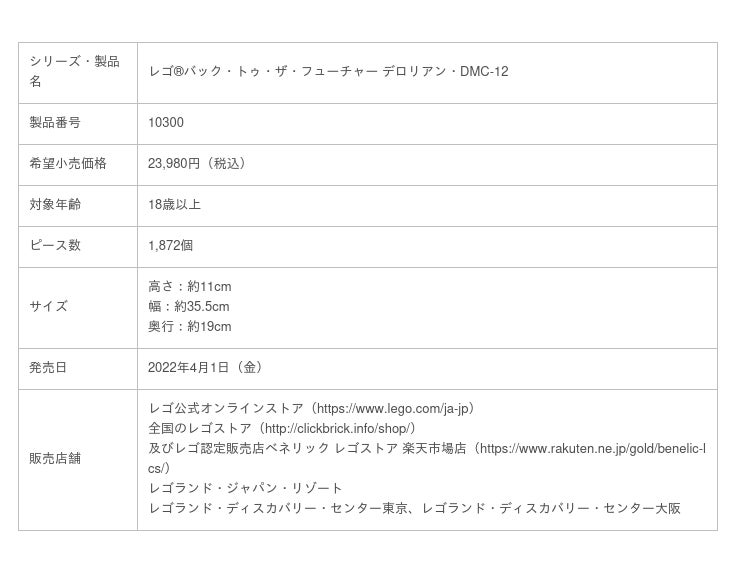 レゴジャパン株式会社(代表取締役社長:長谷川敦/所在地:東京都港区、以下レゴジャパン)は、映画『バック・トゥ・ザ・フューチャー』シリーズで最も象徴的であるタイムマシンのデロリアンを再現した「レゴ(R) バック・トゥ・ザ・フューチャー デロリアン・DMC-12」を2022年4月1日(金)より販売開始します。