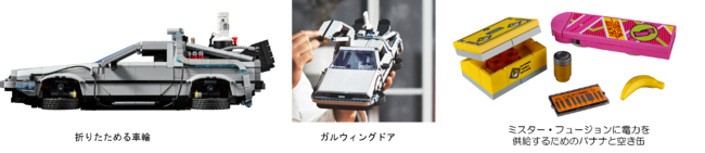 象徴的な光る次元転移装置、最初の動力として使われた小型の原子炉、飛行モード用に折りたためる車輪、ダッシュボード部分にプリントされたタイムサーキットの「目標時刻」「現在時刻」「前回の出発時刻」、開閉するガルウイングのドアとボンネットに加え、マーティーのホバーボードや交換可能なナンバープレートなどの隠れアイテムなどシリーズ3部作のディテールを忠実に再現しています。さらに、映画1作目のラストで登場した新たな動力装置のミスター・フュージョンに電力を供給するためのバナナと空き缶や、ドク・ブラウンとマーティー・マクフライのレゴ・ミニフィギュアも付属しています。