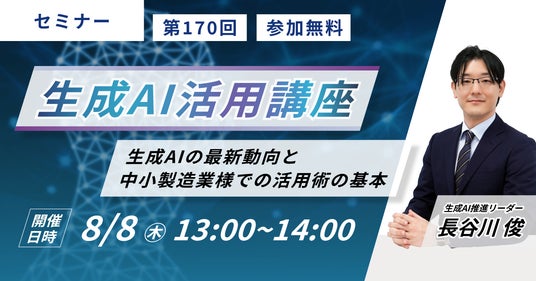 株式会社テクノア(本社:岐阜県岐阜市、代表取締役:山崎 耕治)は、2024年8月8日(木)13時より、中小製造業様での生成AI活用術をテーマにした「生成AI活用講座」をオンラインで開催いたします。