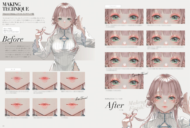 カバー・巻頭の描きおろし作品に加え、SNS 25万いいねで話題を呼んだ「秋色メイク」、自身のブランド「MASCATALE」のファッションイラストやデザイン画など美麗イラストを150点以上収録。すっぴんのイラストにメイクしていく「イラストメイクアップ術」も必見です!