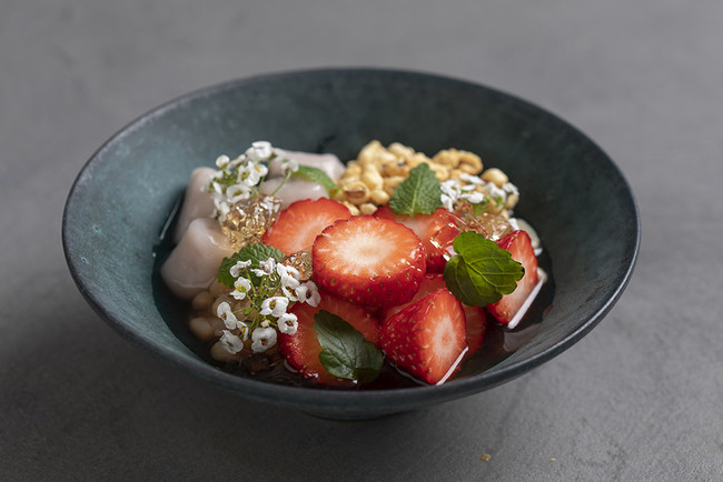 春の訪れを感じさせる、あまおういちごをたっぷり使用した豆花。水面がキラキラ光る様子をイメージしたエルダーフラワーのジュレ、ピーナッツ、白小豆やタロイモ団子など様々な味や食感を楽しむ事ができます。