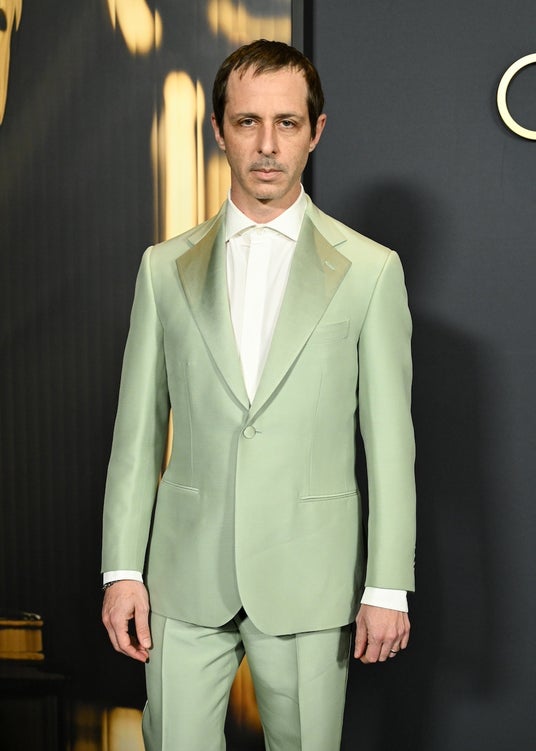 俳優のジェレミー・ストロングは、第15回ガバナーズ賞授賞式にて、淡いセージ色のウールとシルク混紡のロロ・ピアーナのカスタムメイドのスーツを着用して出席しました。