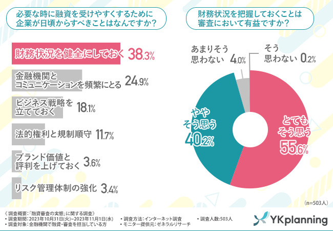 「必要な時に融資を受けやすくするために企業が日頃からすべきことはなんですか?」と質問したところ、『財務状況を健全にしておく(38.3%)』と回答した方が最も多く、次いで『金融機関とコミュニケーションを頻繁にとる(24.9%)』『ビジネス戦略を立てておく(18.1%)』『法的権利と規制順守(11.7%)』『ブランド価値と評判を上げておく(3.6%)』『リスク管理体制の強化(3.4%)』と続きました。