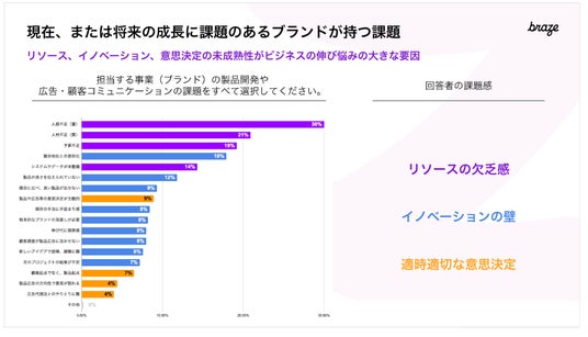 現在、または将来の成長に課題のあるブランドが持つ課題感を聞くと、1.人材・予算・データの不足などのリソースの欠乏感、2.ビジネス成長につながる製品企画やブランディング強化を起こすためのイノベーションの壁を感じる回答が多くを占めた。強い製品・サービスの更新と差別化の必要性を感じながらも、適時的確な意思決定が行われず、投資タイミングを逃している傾向が読み取れます。結果、限られたリソースの中で、足元のビジネスを遂行しつつも、将来の成長に不安を抱えている現状が明らかになりました。