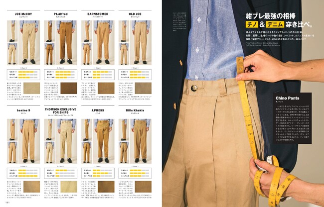 紺ブレに合わせるパンツの二大巨塔と言えば、チノパンツとデニムパンツです。そうは言ってもそのブランド数、アイテム数は膨大。そこで、我々編集部が名作パンツを厳選したうえで、それぞれを実際に穿き比べてみました。チノパンツだけでも、「Southwick(サウスウィック )」のようなかなりドレッシーでスラックスのディテールを要するものもあれば、「benine 9(ビナイン)」のように太いシルエットで現代的な気分で穿きこなせるものまで様々。このカタログを参考に、紺ブレに合わせたい自分好みのパンツを探していただければと思います。