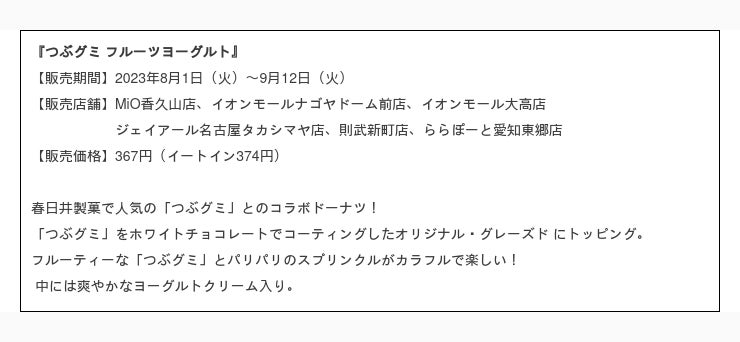 『つぶグミ フルーツヨーグルト』は、子供から大人まで幅広い層に人気の「つぶグミ」とコラボした、カラフルでPOPなドーナツです。「オリジナル・グレーズド(R)」を優しい甘さのホワイトチョコでつつみ、フルーティーな「つぶグミ」と、パリパリのスプリンクルを華やかにトッピングしました。生地の中には、フルーティーな味わいに合わせた爽やかなヨーグルトクリームを詰めています。生地とトッピングによる様々な食感や、グミによって味わいの変化が楽しめる、新感覚なドーナツです。