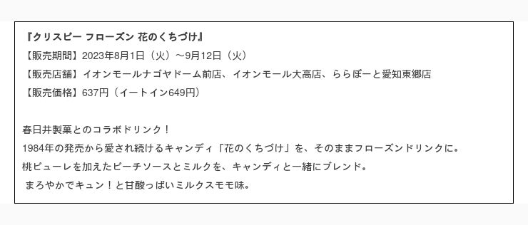 クリスピー・クリーム・ドーナツ・ジャパン株式会社(本社:東京都渋谷区、代表取締役社長:若月 貴子、以下:KKDJ)は、老舗の菓子メーカーである春日井製菓株式会社(本社:愛知県名古屋市西区、代表取締役社長:春日井 大介、以下:春日井製菓)とコラボレーションしたドーナツ2種とフローズンドリンクを、愛知県のクリスピー・クリーム・ドーナツ店舗※1 にて、2023年8月1日(火)から期間・数量限定で販売します。