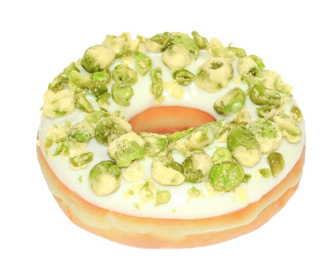 『クラッシュドグリーン豆』は、おやつとしてはもちろん、お酒のおつまみとしても人気が高い、今年発売50周年を迎える春日井製菓の「グリーン豆」とコラボしたドーナツです。クリスピー・クリーム・ドーナツで一番人気の「オリジナル・グレーズド(R)」をホワイトチョコでコーティングし、粗く砕いた「グリーン豆」をふんだんにトッピングしました。甘くとろけるようなドーナツに、「グリーン豆」のサクッとした食感と程よい塩気が合わさり、美味しさを引き立てます。