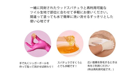 ・手で丸くシュガーボールを作って貼ってむだ毛が気になる箇所にON!ピリッと簡単に剥がせます。