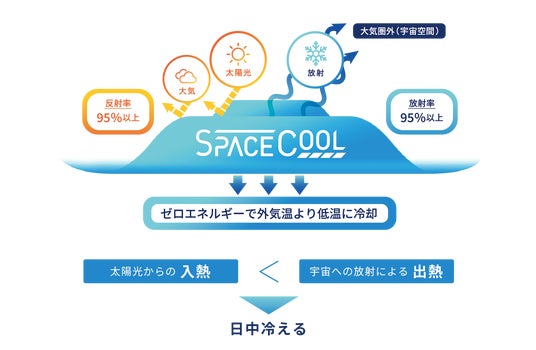 本素材は、直射日光下において、太陽光と大気からの熱をブロックし熱吸収を抑えるだけではなく、放射冷却の原理により宇宙に熱を逃がすことで、ゼロエネルギーで外気温よりも温度低下することを可能にした新素材(*1)です。