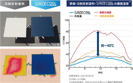 (*1):独自の光学制御技術を用いて、太陽光の入熱を抑え、熱ふく射(*2)による放熱を大きくした材料設計により実現