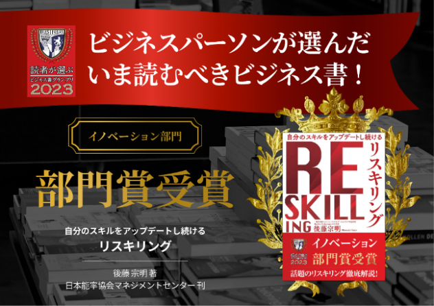 「読者が選ぶビジネス書グランプリ2023」のイノベーション部門賞の受賞、誠にありがとうございます。「リスキリング」は昨年10月の岸田総理の所信表明演説以降、大きな注目をあびるようになりました。くわえて、著者の後藤さんも昨年開催の「日経リスキリングサミット」において岸田総理との座談会に登壇するなど、日本のリスキリングの第一人者として活躍されています。