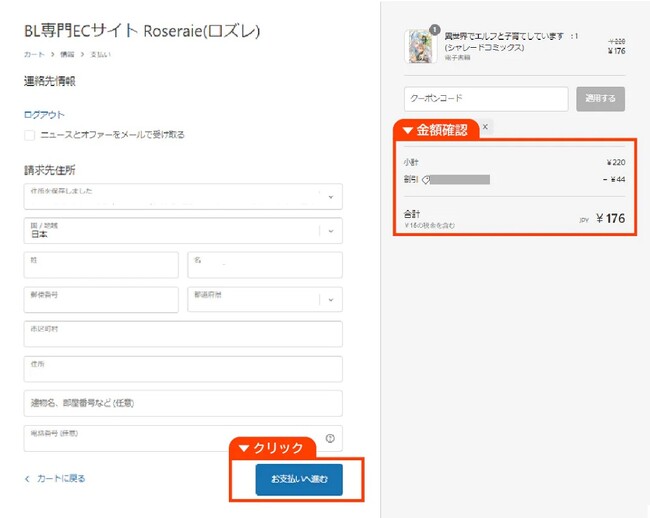 適用された金額が確認できたらお支払いに進むで決済にお進みください!