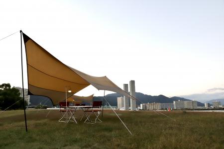 snow peakのタープを設置し湖畔でのアウトドア体験を提供します。