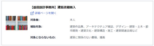 - 国内外への建築視察にまつわる費用、建築書籍購入、ツール導入など業務創造性を高められるメニューを独自で追加できる