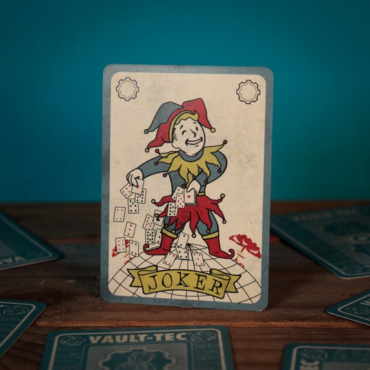独自に作られた Vault Boy のエースと、Fallout にインスパイアされたジャック、クイーン、キングのカードが含まれています。2 枚のジョーカーも Vault Boy スタイルでデザインされており、デッキに高級感を与えています。