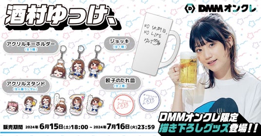 「DMMオンクレ」は、”酒テロ”動画で人気のYouTuber「酒村ゆっけ、」のオリジナルグッズ第2弾を展開いたします。餃子のたれ皿やジョッキなど、お酒好きにはたまらない商品のほか、DMMオンクレ描き下ろしのミニキャラアクリルキーホルダーやアクリルスタンドなど「酒村ゆっけ、」ファンも必見のラインナップです。