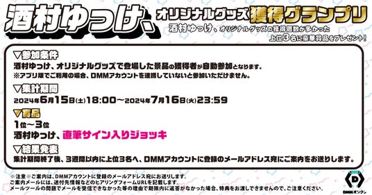 合同会社DMM.com(本社:東京都港区、会長 兼 CEO亀山敬司、https://dmm-corp.com/ 以下DMM )が提供するオンラインクレーンゲームサービス「DMMオンクレ」は、2024年6月15日(土)より、チャンネル登録者107.4万人(2024年6月時点)の人気YouTuber「酒村ゆっけ、」のオリジナルグッズ第2弾を展開いたします。また、「酒村ゆっけ、」オリジナルグッズの獲得個数が多かった上位3名に、直筆サイン入りジョッキをプレゼントする「酒村ゆっけ、獲得グランプリ」を開催いたします。