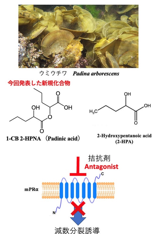 我々は、この化合物に、ウミウチワの属名「Padina」にちなんで「Padinic acid」という名称を提案しました。Padinic acidは、ゼブラフィッシュとマウスの排卵抑制効果を示しました。Padinic acidは、排卵の前段階である卵成熟を誘導する経路のmPRに作用し、卵成熟と排卵を停止させたと考えられます。mPRに特異的に作用する非ステロイド性の拮抗剤はこれまで報告されていないため、Padinic acidは新規医薬品候補として期待されます。
