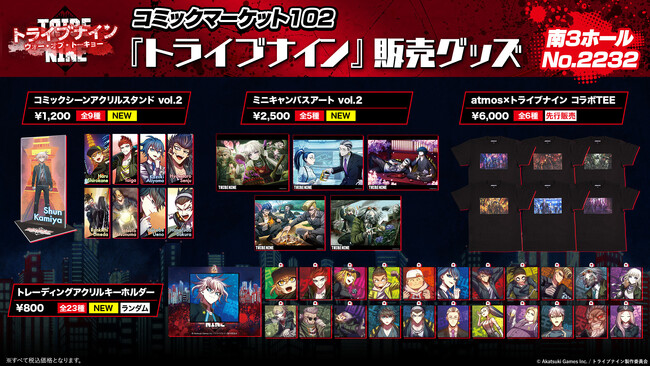 コミックマーケット102「アカツキゲームス」ブースにて『トライブナイン』のグッズ販売を実施いたします。縦読みフルカラーマンガアプリ「HykeComic」にて連載中の『トライブナイン/ウォー・オブ・トーキョー』のグッズ販売や、原宿から世界に発信するスニーカーショップ『atmos』とのコラボレーショングッズの先行販売を行います。