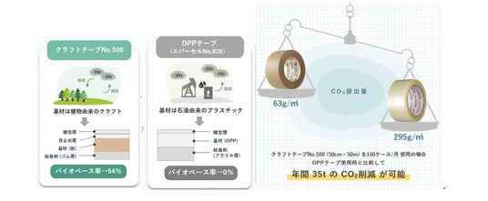 クラフト紙を基材としているクラフトテープは、バイオベース率※1が54%と、OPPテープと比較してプラスチック使用量の削減、そしてそれに伴うCO2排出量の大幅な削減に貢献しています。さらに個包装のパッケージを無くすことで当社従来品と比較して、年間約660kg※2のCO2削減に貢献できます。