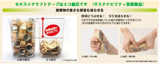 当社は、創業初期からテープの製造を開始し、クラフトテープにおいては60 年以上の歴史を誇ります。クラフトテープのトップメーカーとして、確かな品質を維持するため、製造は国内工場で行っています。また、外箱には、今春より登場した当社テープ事業の公式キャラクター“セキツムリ”をあしらっており、本キャラクターはSNSなどを通じ環境貢献の取り組みをより多くの方に知っていただくための活動も行っています。