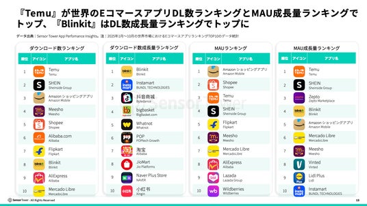 『Temu』が世界のEコマースアプリダウンロードランキングとMAU成長率ランキングでトップ、『Blinkit』はダウンロード成長率ランキングでトップに