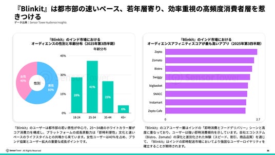 『Blinkit』のユーザーは都市部の若い男性が中心で、25~34歳のホワイトカラー層がコア消費層を構成しており、女性ユーザーは40%を占めています。同時に、『Blinkit』のコアユーザー層はインドの「即時消費とフードデリバリー」シーンと高度に重なっており、ユーザーは強い即時消費傾向を示しています。自社エコシステム(Bistro、Zomato)の深化と差別化された体験(スピード、割引、商品品質)を通じて、『Blinkit』はインドの即時配送市場においてより強固なユーザーロイヤリティを確立することが期待されます。