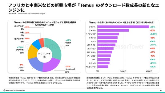 アフリカやラテンアメリカなどの新興市場が、『Temu』のグローバル成長の新たなエンジンとなっています。ラテンアメリカは世界をリードし、『Temu』の総ダウンロード数の約30%を占めています。アフリカ市場も急速に台頭しており、ダウンロード数が+168%急増し、多くの新規ユーザーをもたらしています。ブラジルは逆風の中+84%の急上昇で最大の単一市場となりました。ナイジェリアでのダウンロード数は84倍に急増して世界3位となり、新興市場におけるブランドの強力な魅力と成長ポテンシャルを示しています。